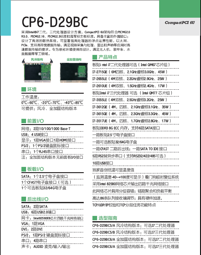 采用Intel®i7二代,,三代处理器设计方案,,CompactPCI 6U架构符合PICMG2.0 R3.0、、PICMG2.16、、、PICMG2.3标准和海军标主板标准。。。。具备丰富的外围接口; 设计了高效的散热系统,,,可显著提高处理器的浮点运算性能,,以太网、、 ...