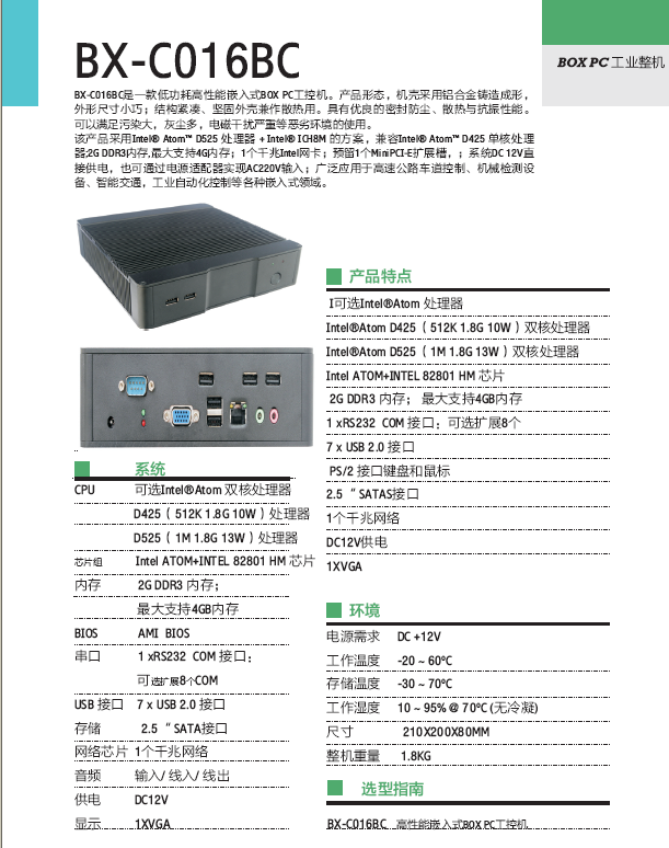 BX-C016BC是一款低功耗高性能嵌入式工控机。。产品形态,,,,机壳采用铝合金铸造成形,,,外形尺 寸小巧;结构紧凑、、、、坚固外壳兼作散热用。。具有优良的密封防尘、、、、散热与抗振性能。。。可以满 足污染大,,灰尘多,,,电磁干扰严重等恶劣...