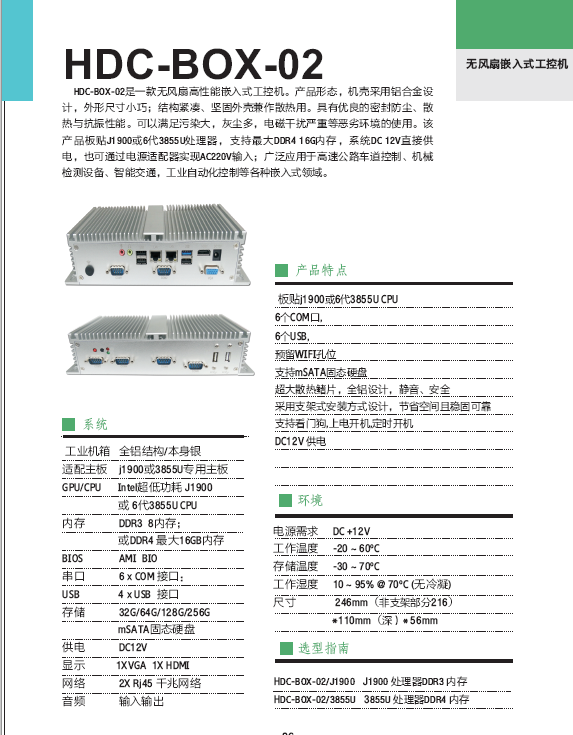 HDC-BOX-02是一款无风扇高性能嵌入式工控机。。。产品形态,,机壳采用铝合金设计,,外形尺寸小巧;结构紧凑、、、坚固外壳兼作散热用。。。具有优良的密封防尘、、散热与抗振性能。。。。可以满足污染大,,灰尘多,,,,电磁干扰严重等恶劣环境...