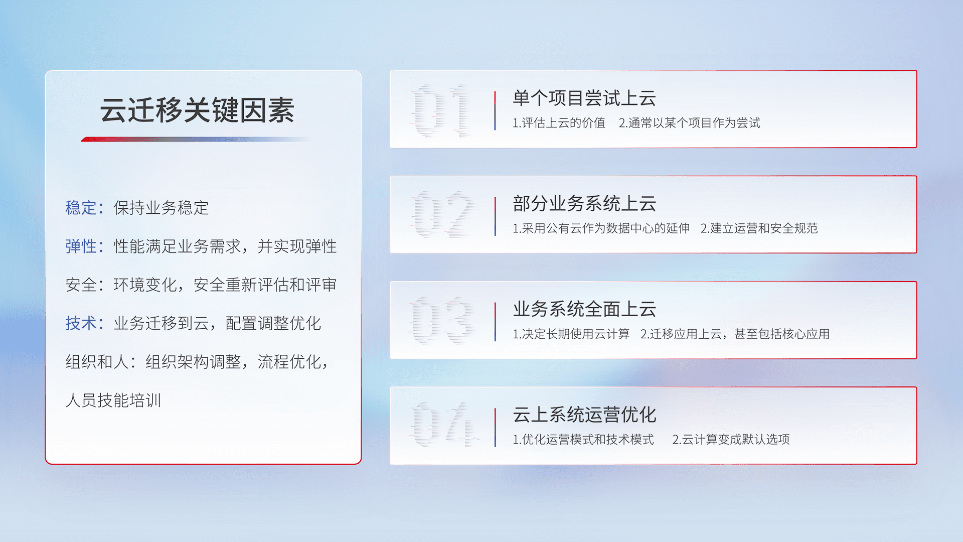 结合实际业务,,,,从规划设计、、、、云平台选型、、、云原生改造、、数据迁移、、、、集成交付,,,,迁移全过程为客户识别最佳上云路径,,做好风险识别管理,,,,设计网络架构、、、身份权限、、安全审计合规、、、、操作审计、、日志审计、、监控告警策略、、、多站点容灾设计等,,,对云上基础设施进行整体规划,,,,提升IT治理水平,,,以满足弹性、、高可用、、、、高性能的需求。。。。