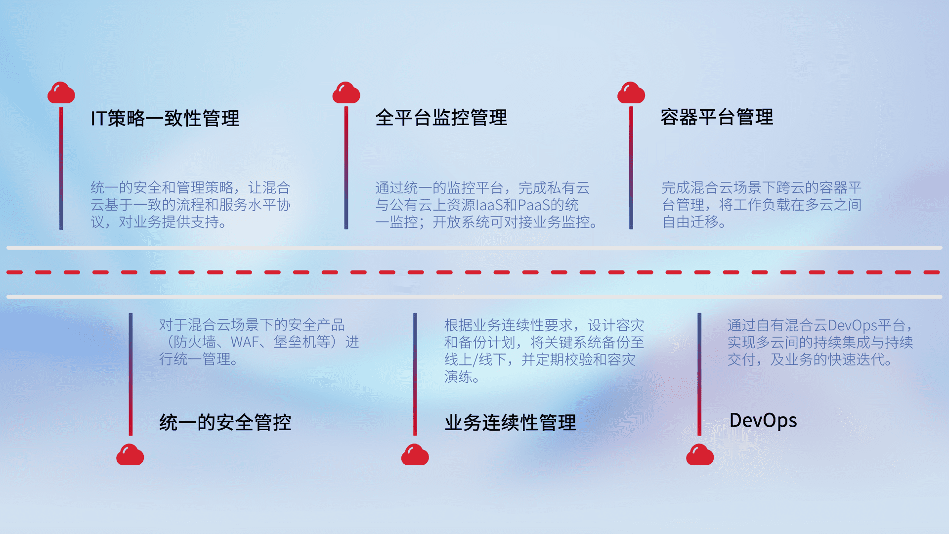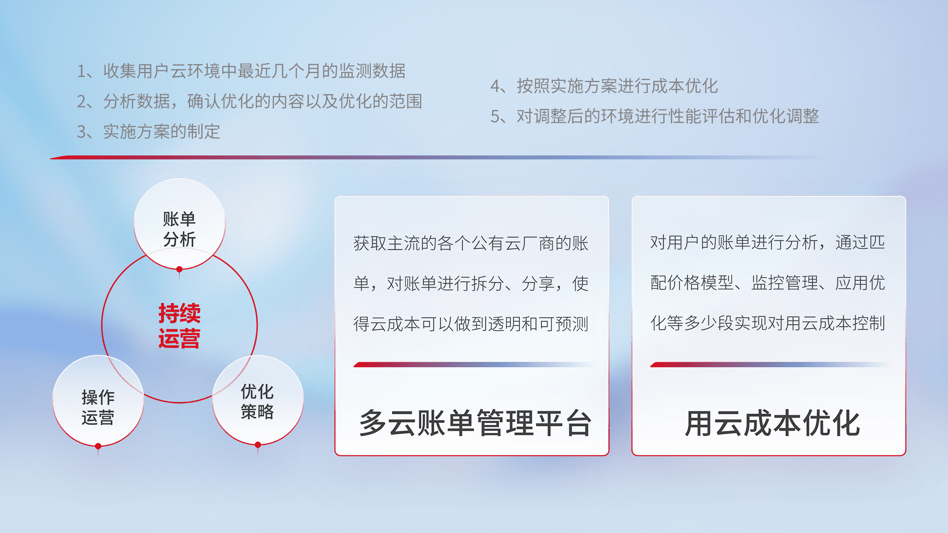 通过多云纳管,,,,以统一的资源数据模型把客户的云资源进行抽象和封装,,,进而实现对多云资源的统一操作,,,保障云资源管理的可靠性、、、、稳定性与可用性。。量身定制化运维内容,,,,配置、、、开发运维、、、、补丁管理、、、、备份、、监控、、、、认证和访问管理、、、、审计和日常巡检等,,,保障在用云过程中的可靠度,,稳定度以及高可用率。。。
