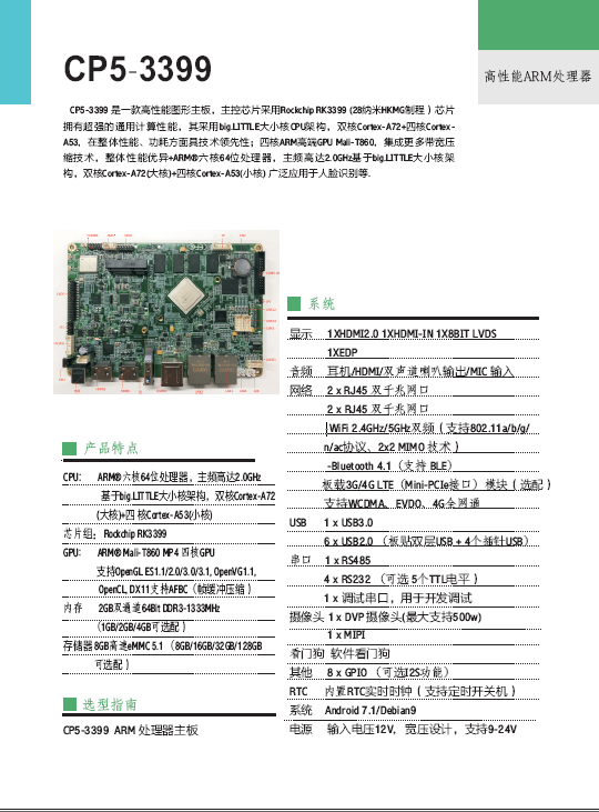 CP5-3399 是一款高性能图形主板,,,主控芯片采用Rockchip RK3399 (28纳米HKMG制程)芯片 拥有超强的通用计算性能,,其采用big.LITTLE大小核CPU架构,,双核Cortex-A72+四核Cortex- A53,,在整体性能、、、功耗方面具技术领先性...