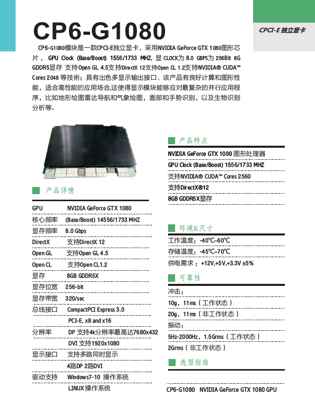 NVIDIA GeForce GTX 1080 图形处理器 GPU Clock (Base/Boost) 1556/1733 MHZ 支持NVIDIA® CUDA™ Cores 2560 支持DirectX®12 8GB GDDR5X显存