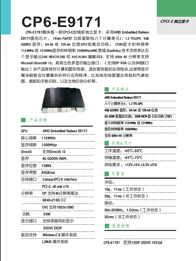 CP6-E1791模块是一款CPCI-E发烧级独立显卡,,,采用AMD Embedded Radeon