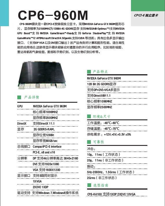 CP6-960M模块是一款CPCI-E发烧级独立显卡,,,,采用NVIDIA GeForce GTX 960M图形芯片,,, 显存频率为2500MHZ为128Bit 4G GDDR5显存 支持NVIDIA® Optimus™1支持NVIDIA GPU Boost™支持NVIDIA GameStream™-Ready支持GeFo...