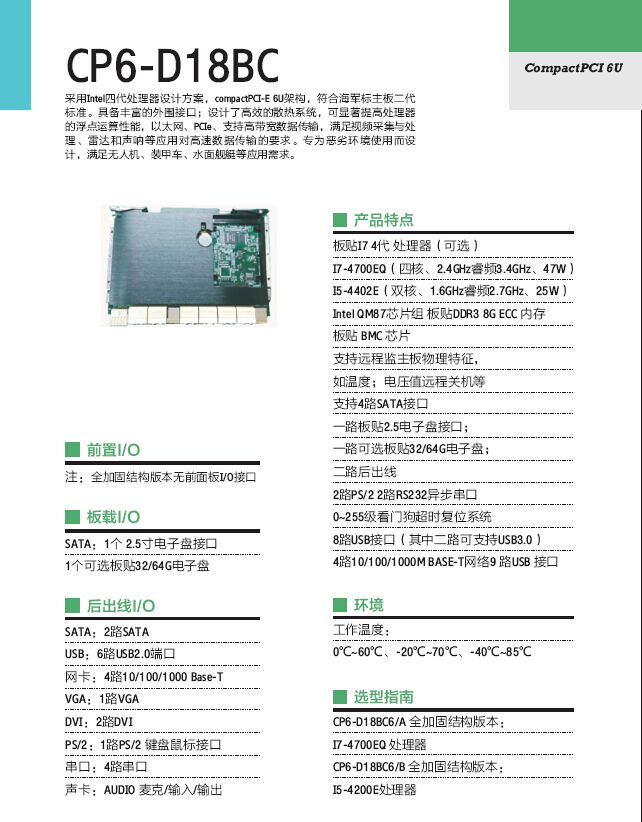 CP6-D18BC 采用Intel四代处理器设计方案,,compactPCI-E 6U架构符合海军标主板二代 标准。。。具备丰富的外围接口;设计了高效的散热系统,,,可显著提高处理器 的浮点运算性能,,,以太网、、、PCIe、、支持高带宽数据传输,,,满足视频...