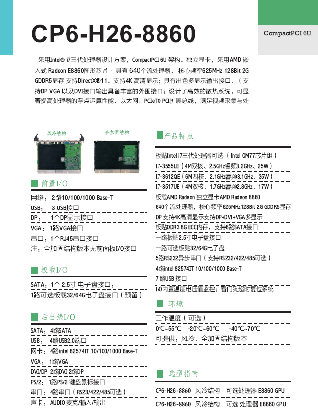 采用Intel® i7三代处理器设计方案,,,,CompactPCI 6U 架构。。。板载AMD 嵌入式 Radeon E8860独立显卡,GPU 具有 640个流处理器,,, 核心频率625MHz 128Bit 2G GDDR5显存 支持DirectX®11。。。。支持4K 高清显示;具有出色多显示输...