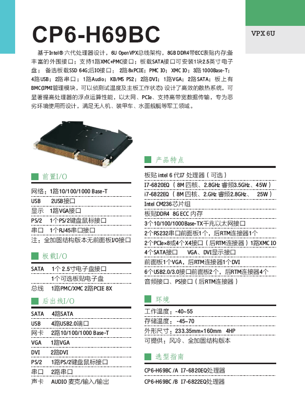 2个PCIe×8或4个X4接口(后RTM连接器)1路XMC IO